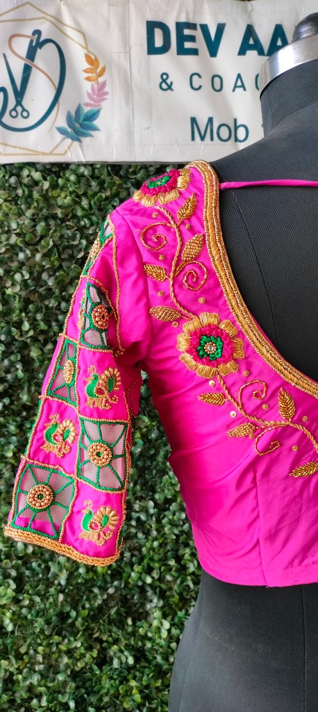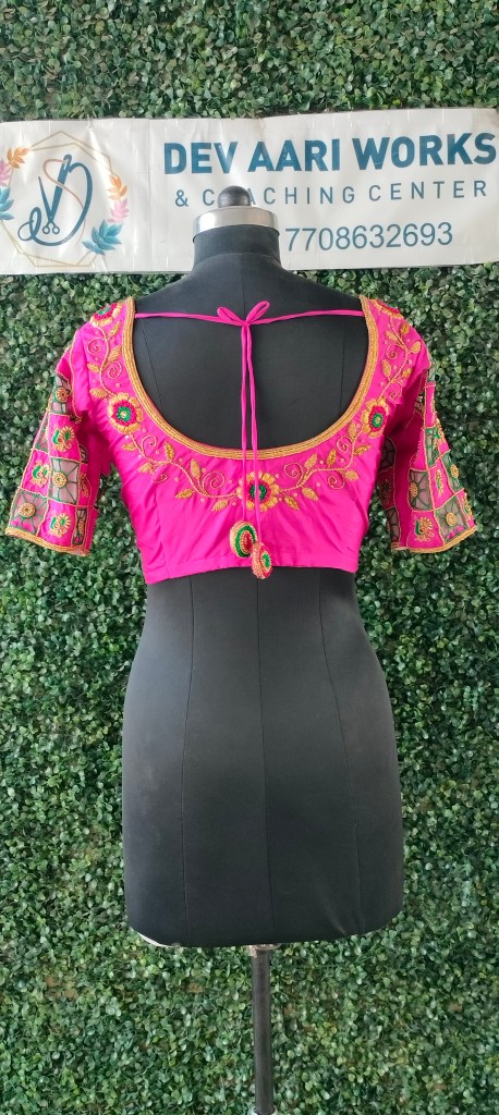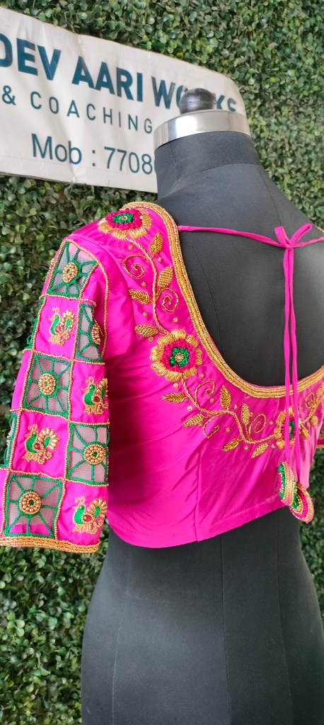 The intricately crafted aari embroidery combined with delicate cut work embellishments on this blouse result in a stunning piece of artistry. Adorned with exquisite zardosi work that adds a touch of opulence, this blouse is further enhanced by a layer of elegant net fabric. The fusion of these elements creates a garment that exudes elegance and sophistication, making it a perfect choice for those seeking a unique and luxurious addition to their wardrobe. Ideal for special occasions and festive celebrations, this blouse is sure to captivate attention and elevate any ensemble with its unparalleled beauty and craftsmanship.