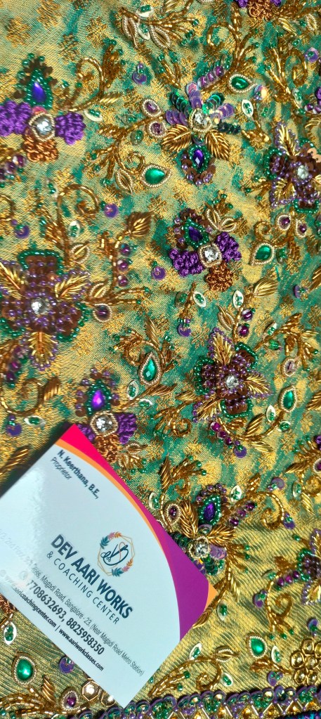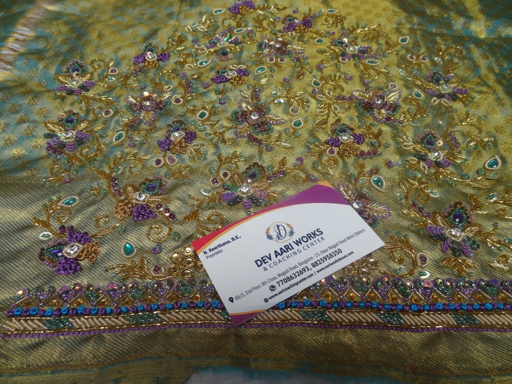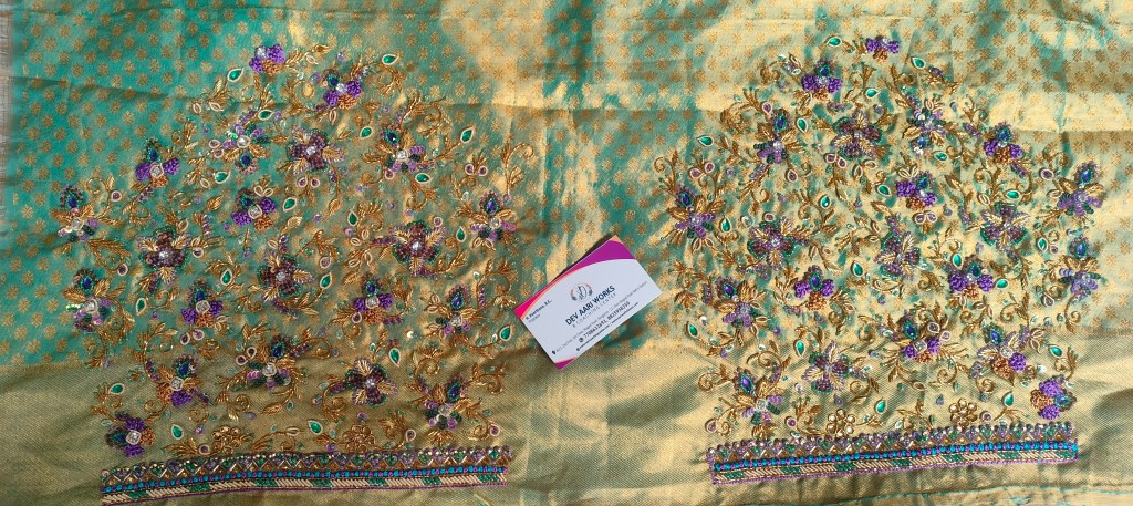 Dev Aari Works and Coaching Center specializes in offering a wide range of services catering to various styles of bridal blouse aari embroidery. Our dedicated team of skilled aari embroidery artisans meticulously crafted a stunning bridal blouse masterpiece, exemplifying exquisite craftsmanship and flawless finishing. This particular design showcases a harmonious blend of zamki, zardozi, and beadwork, resulting in a truly captivating aesthetic. Committed to exceeding customer expectations, we prioritize efficiency and promptness, ensuring that even urgent orders are completed within a swift turnaround time of just 4 days. To place your order and experience the artistry of our bridal blouse aari embroidery. please contact us at 7708632693.