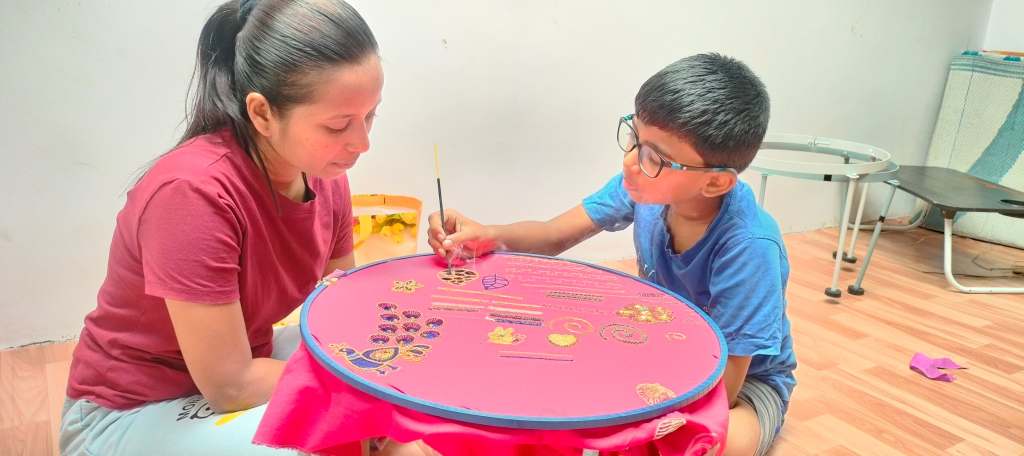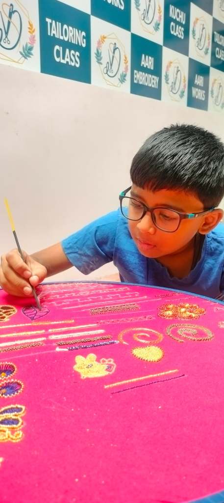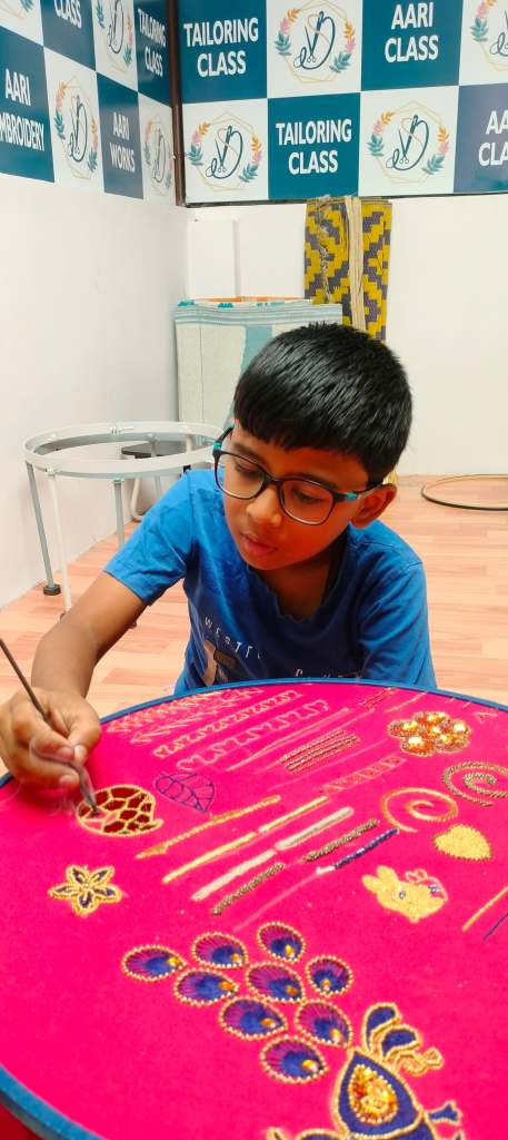 Learning the intricate art of Aari work can be both educational and entertaining, reminiscent of a leisurely pastime. During the holidays, we take the opportunity to impart the skill of Aari work to our cherished son, Dev. Engaging in this craft not only serves as a creative outlet but also encourages him to develop dexterity and patience. By introducing him to Aari work, we aim to redirect his focus from spending excessive time on mobile devices towards cultivating a tangible skill. Through this hands-on experience, Dev is able to create unique pieces that showcase his creativity and dedication, fostering a sense of accomplishment and pride in his craftmanship. The process of learning Aari work together as a family not only strengthens our bond but also provides a meaningful way to spend quality time and create lasting memories.