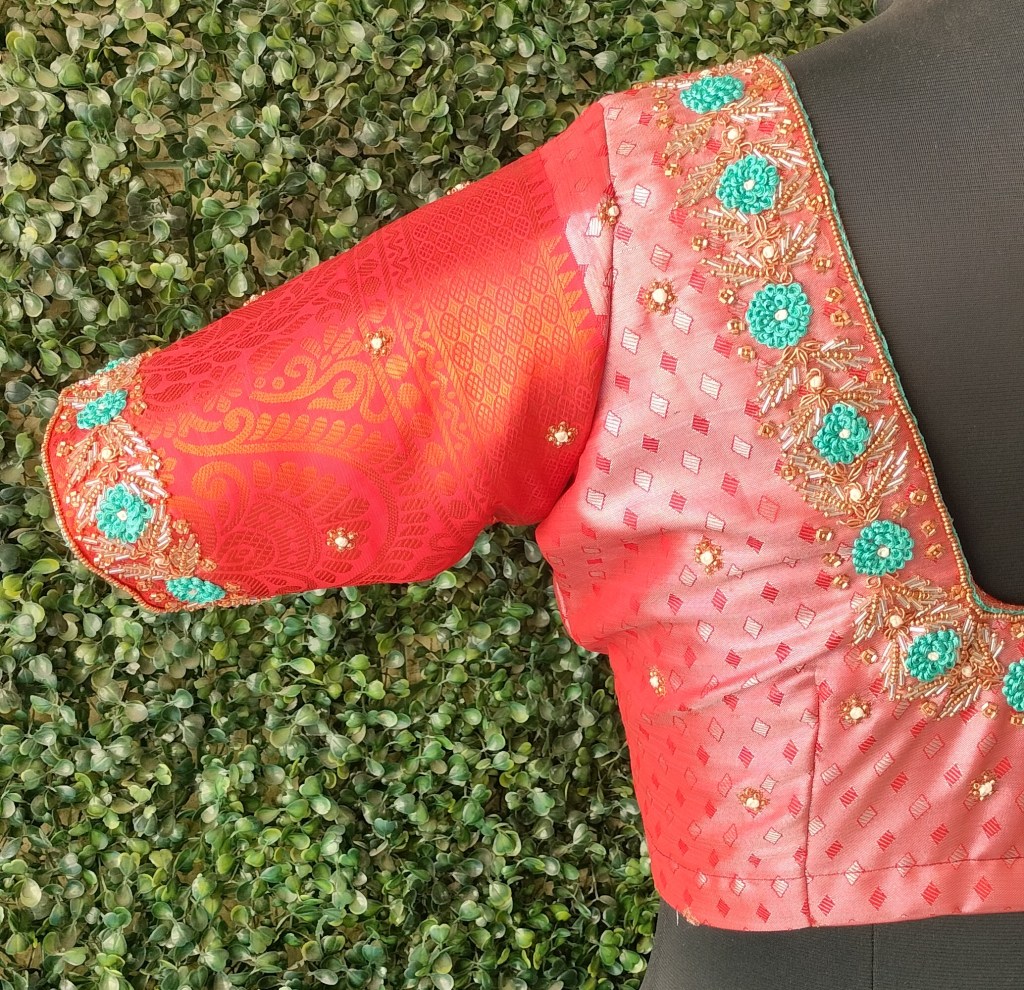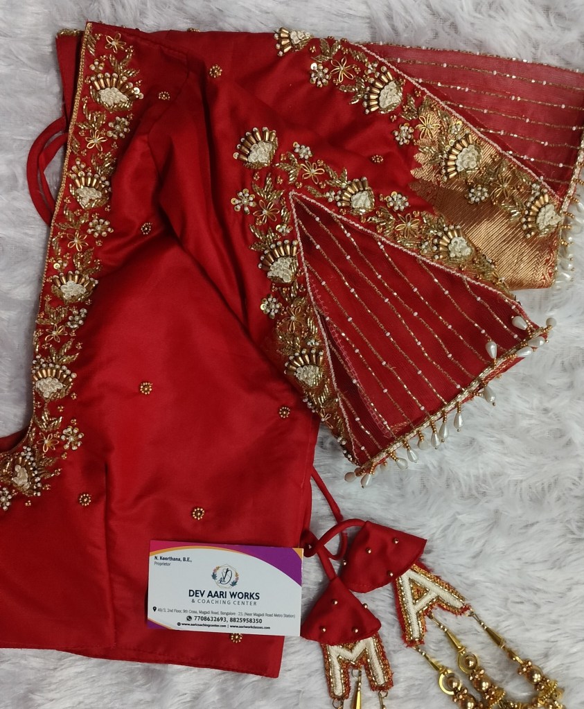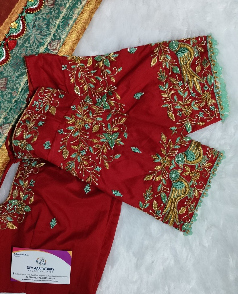 We offer custom aari work blouse designs in Bangalore. Aari work is a type of hand embroidery. It uses a needle with a hook to create detailed patterns. This art form makes blouses unique and beautiful. Our service lets you create a blouse that reflects your style. We work with you to choose designs, colors, and fabrics. For more details or to schedule a consultation, call us. Reach us at 7708632693 to discuss your dream blouse.